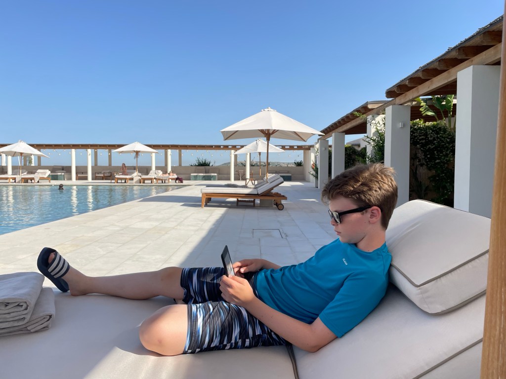 Matt and Xander head to the gym, while Jacob and I read by the pool and swim.