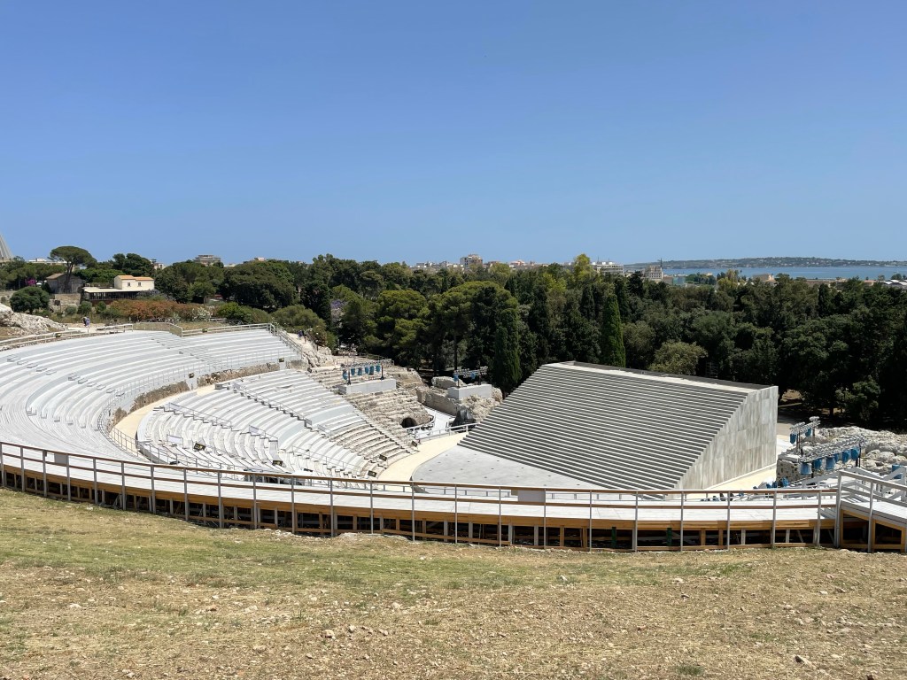 Then on to the Theater itself, which is not nearly as well-preserved as Taormina’s. As connoisseurs of ancient Greek theaters, we are frankly a little disappointed. Or maybe it is now 95 degrees and we are thinking of our hotel’s pools. We stop for a gelato and then head to the car.