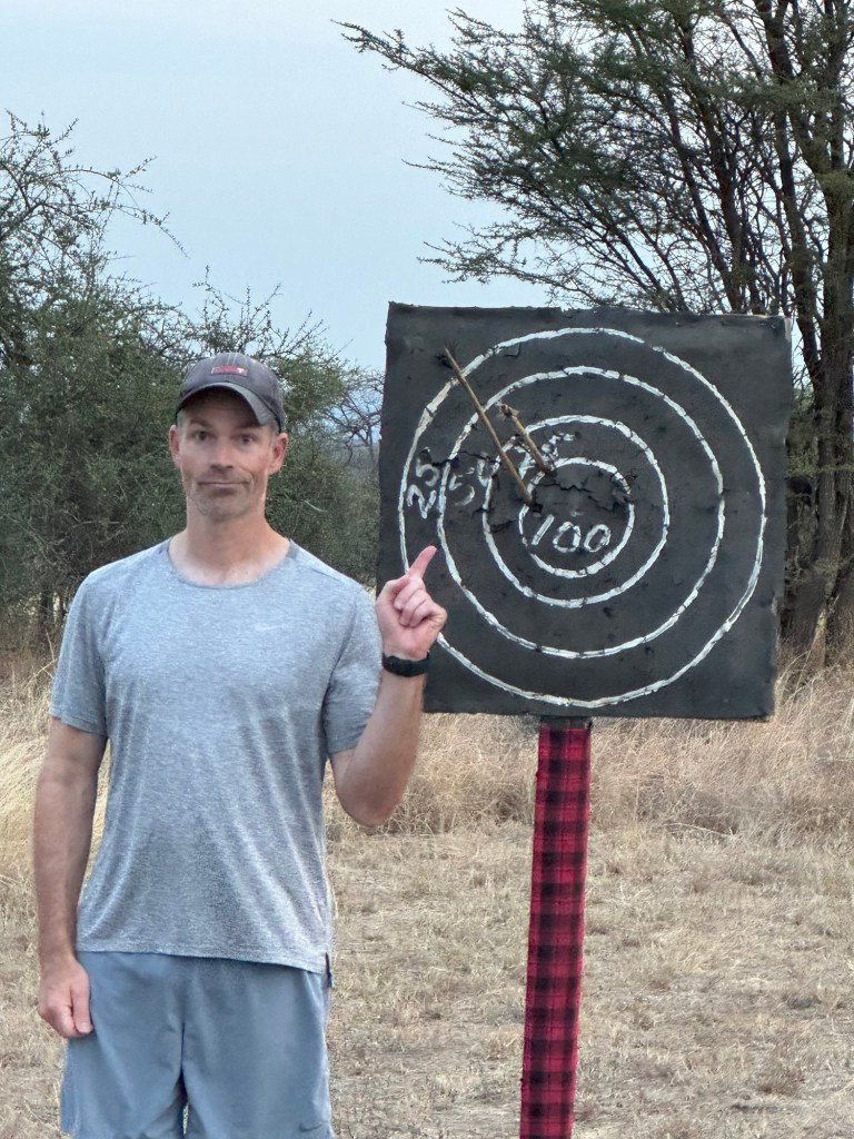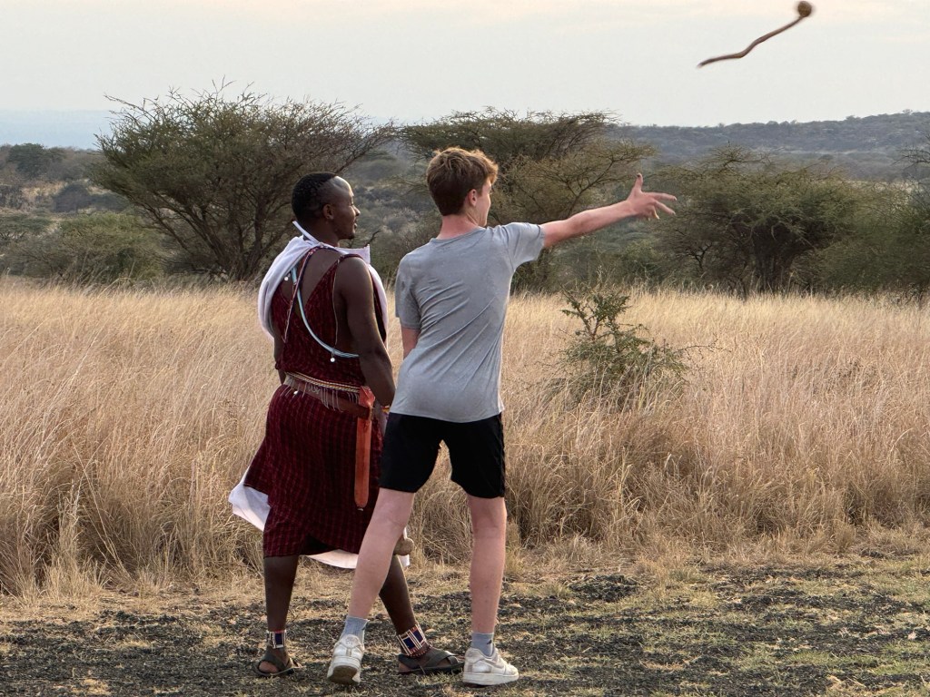 Peter drives us to a grassy spot for a sundowner where a full bar is set up and we meet Alvin, in traditional Maasai red and black garb. We drink gin and tonics while Team Lion (captained by Jacob) faces off against Team Elephant (captained by Leah) in a club throwing and archery throw down.