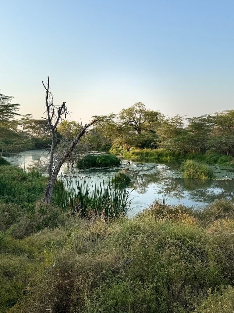 We take a 45-minute plane ride from Nairobi, with a pit stop at a wide open plain where zebras roam, and arrive at the airstrip by our home for two nights: Finch Hattons in Tsavo West National Park. Tsavo is acacia tree bushlands with a few distinct hills and plateaus, and black lava rock.