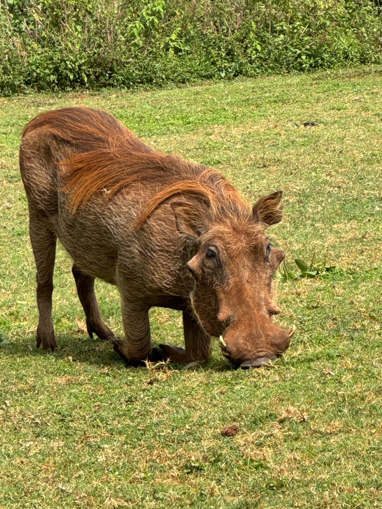 Built in the 1930s, this giraffe sanctuary/hotel looks like a hunting lodge. Wart hogs mow the lawn.
